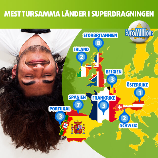 Som du kan se från tabellen ovan är Sverige än så länge inte med på topplistan över rekordvinster i Europa. De högsta priserna i EuroMillions-dragningen har istället tilldelats spelare från Schweiz, Frankrike, Storbritannien, Portugal och Spanien. Nedanstående karta visar vilka länder som har vunnit EuroMillions Superdragningar flest gånger sedan dess lansering den 9 februari 2007.
